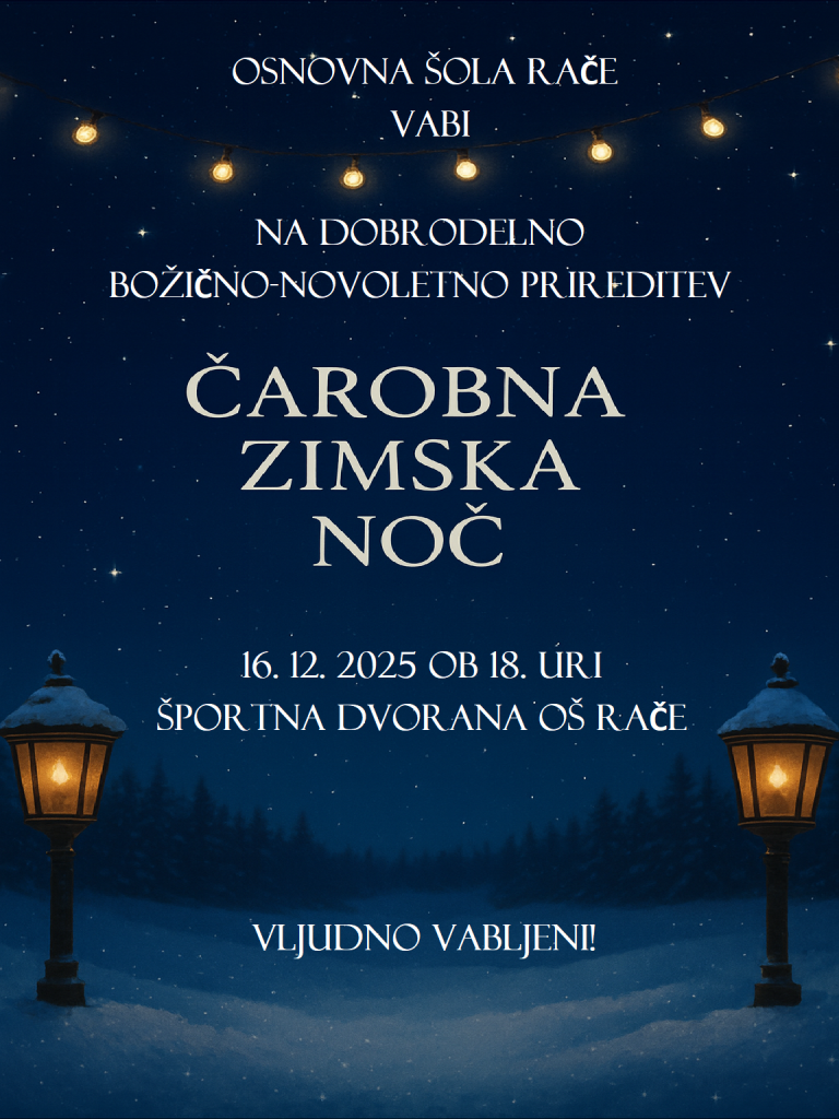 Spoštovani, prijazno vas želimo spomniti, da bo jutri, 16. 12. 2025, ob 18. uri v Športni dvorani OŠ Rače potekala božično-novoletna prireditev Čarobna zimska noč. Vabimo vas, da se nam pridružite na prijetnem prazničnem večeru, polnem glasbe, igre, plesa in skupnega...